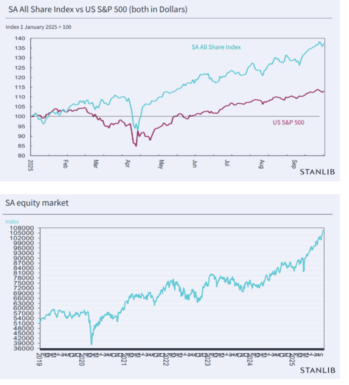 The graphs below show the performance of the JSE All Share versus the S&P500 in 2025 and over the past six years, courtesy of Stanlib chief economist Kevin Lings.